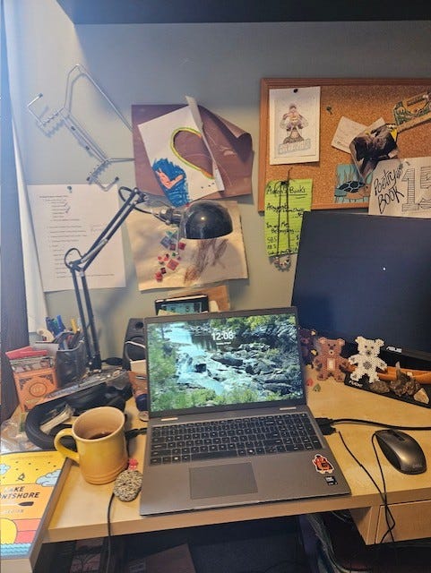 My writing space is in a constant state of explosion/implosion from the amount of books in it. Books on the barnboard shelves. Books on bookcases. Books on the floor. Books hanging from the ceiling. My desk is organized clutter, organized chaos. There’s my laptop. There’s a second monitor to stage left. Around the second monitor: three melt bead bears (brown, black, polar). Three little wooden carvings: a green tent, an orange tent, a pine tree, a little wooden carving that says “FUCK.” A small wooden canoe. Crystals. An interesting shaped rock from Lake Superior, with a busted Trey Anastasio guitar key chain on top. The corkboard and wall covered in lists, drawings, photos. Various and sundry writing/office supplies. Art by my daughter. Mementos from the deep past. Usually a mug of tea or a bowl of chocolate covered almonds.